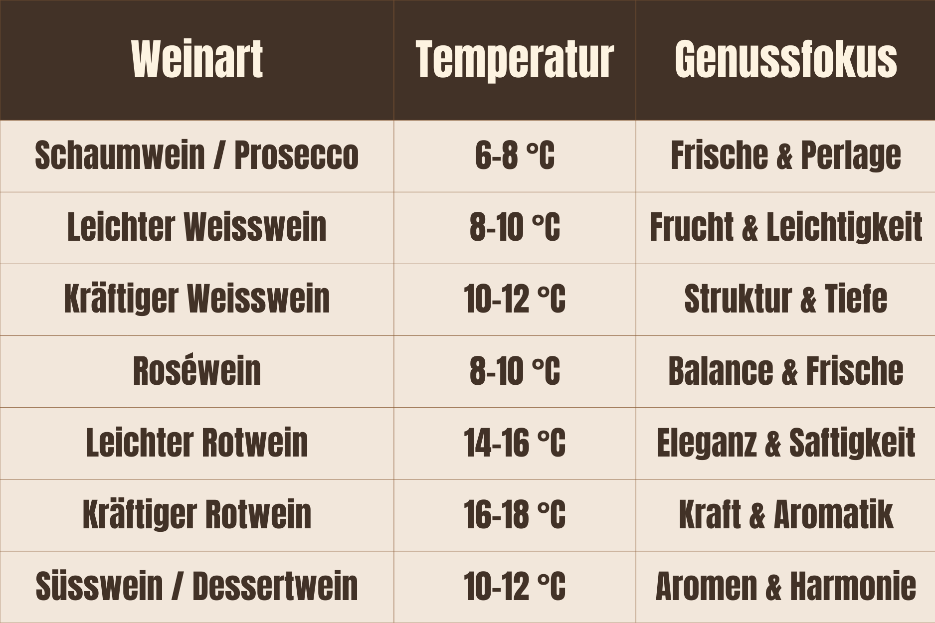 Die folgende Tabelle zeigt, bei welchen Temperaturen verschiedene Weinarten ihr volles Potenzial entfalten: